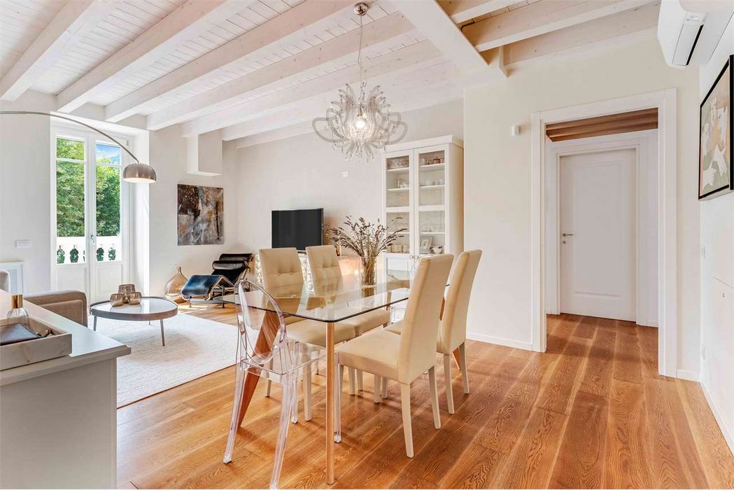 In zona fronte lago, proponiamo in vendita spazioso trilocale con cucinotto semiabitabile, con zona living esterna esclusiva, lavanderia e balcone vista lago. L'unità, inserita in un fabbricato elegantemente ristrutturato, è composta da ingresso sul soggiorno con balcone vista lago, cucinotto con accesso ad ampio terrazzo abitabile esterno, disimpegno, due camere una delle quali con accesso all'ampio terrazzo, bagno e cabina armadio predisposta per la realizzazione di un secondo servizio. L'appartamento finemente rifinito dispone di travi in legno a vista sbiancate, parquet di rovere e viene proposto completamente arredato con mobili di altissima qualità. Completano la proprietà un ripostiglio a servizio dell'ampia zona giorno esterne adibito a lavanderia, una cantina e un comodissimo box auto. Termoautonomo. In the frontal area we offer for sale spacious three-room apartment whit almost habitable kitchen with exclusive living area, laundry and balcony overlooking the lake. The unit is inserted in a renovated building. It is consist of an entrance to the living room with a balcony overlooking the lake, a kitchen with access to the large outdoor terrace, hallway, two rooms, one of those with access to the terrace, bathroom, walk-in closet. The apartment has exposed wooden beams, parquet and is proposed fully furnished with high quality furniture. The property includes a storage room, a cellar and a very comfortable garage. Climate control. CLASSE ENERGETICA: A 24,65 kWh/m2 a