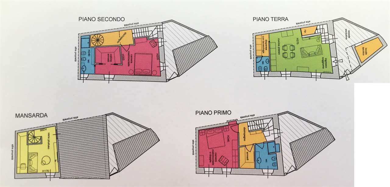 Colle di Compito, terratetto centrale allo stato grezzo, ristrutturato nelle strutture, elevato su tre livelli e composto al piano terra da: ingresso, soggiorno con angolo cottura, ripostiglio con locale lavanderia e bagno con doccia. Al primo piano dismpegno zona notte, una camera matrimoniale con cabina armadi e bagno con doccia. Al secondo piano disimpegno, una camera matrimoniale con cabina armadi e bagno con doccia. Al piano superiore mansardato camera singola. A corredo resede esterna privata e ripostiglio esterno in muratura. CLASSE ENERGETICA: In fase di valutazione